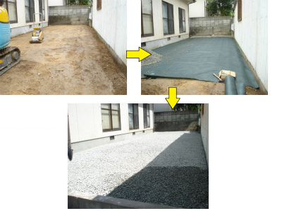 工事工程は、鋤取り・整地→転圧→防草シート張り→砂利を敷く→完成!